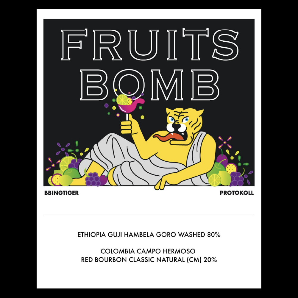 [2025] 다시 만난 삥타이거와 프로토콜의 콜라보 블렌드를 소개합니다. 무덥고 습한 그리하여 축축 처지는 이 여름.청량한 커피 한 잔을 전하고 싶은 마음에 만들어진 후루츠밤 블렌드입니다. 플로럴 하면서도 라임. 패션후르츠, 포도, 청사과 같은 과일의 뉘앙스가 잘 나타나는 이 블렌드는 해가 뜨거운 한낮에는 시원한 아이스티처럼 해가 진 밤에는 따뜻한 과실차처럼 마시며 이 여름을 버틸 수 있는 커피가 되어주기를 바라봅니다. 블렌드Ethiopia Guji Hambela Goro Washed 80%, Colombia Campo Hermposo Red Bourbon Classic Natral 20% 커핑노트 Cupping NoteFloral • Lime • Passion Fruit • Grape • Green Apple플로럴 • 라임 • 패션후르츠 • 포도 • 청사과 브루잉 가이드 레시피프로토콜의 브루잉 레시피입니다. 이 레시피는 원두 고유의 캐릭터를 또렷하게 느낄 수 있도록 전체적인 밸런스가 잘 느껴지도록 제안합니다. 안내된 방법에 따라 추출하시면, 프로토콜이 생각하는 맛있는 한 잔의 흐름을 가장 안정적으로 즐기실 수 있습니다. 하리오 V60 드리퍼를 기준으로 합니다 추출 전 필터지는 뜨거운 물로 충분히 린싱해 종이 향을 제거하고, 안정적인 추출 환경을 만들어 주세요. [HOT]원두는 18g, 물 온도는 94도를 사용합니다. 다음과 같이 물을 부어줍니다.(뜸) 40g – (30초) 100g – (1분) 80g – (1분 30초) 80g 총 300g의 물을 사용하며,대략적으로 2분 30초 내외로 추출이 완료됩니다. [ICE]원두는 20g, 물 온도는 94도를 사용합니다. 드립 서버에 얼음을 8알 정도를 담고 다음과 같이 물을 부어줍니다.(뜸) 40g – (30초) 60g – (1분) 50g – (1분 30초) 50g 총 200g의 물을 사용하며,대략적으로 2분 10초 내외로 추출이 완료됩니다.