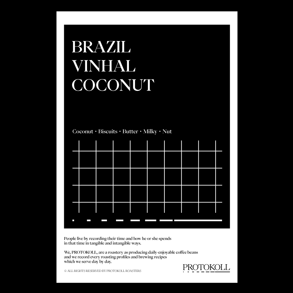[2025] 빈할 농장의 두 농장주는 프로세싱에 많은 관심과 노력을 기울이고 있습니다.워시드, 허니 프로세싱처럼 브라질에서는 보기 힘든 방식을 시도할 뿐만 아니라, 매 시즌 더블, 트리플 퍼먼테이션 같은 독특한 프로세싱을 연구하고 있습니다.이 커피는 잘 익은 체리를 선별하여 36시간 동안 나무 그늘 밑에서 개방된 상태로 드라이 퍼먼테이션 하였습니다.과육을 제거하고 점액질이 남아있는 상태에서 발효 탱크에 물과 함께 넣어 155시간 동안 무산소 발효시킨 뒤 또다시 건조대에서 20일 동안 말렸습니다.프로토콜에서는 작년부터 샘플링을 하며 한 번쯤 소개해 드리고 싶었던 빈할 농장의 커피입니다.코코넛의 향미와 단맛이 직관적으로 느껴지는 재미있는 경험을 해볼 수 있는 커피입니다. 원산지 Brazil지역 Cerrado Mineiro, Minas Gerais품종 Red catuai 99 가공 double fermented Honey고도 1,000m 커핑노트 Cupping NoteCoconut • Biscuits • Butter • Milky • Nut코코넛 • 비스킷 • 버터 • 밀키 • 견과류 브루잉 가이드 레시피프로토콜의 브루잉 레시피입니다. 이 레시피는 원두 고유의 캐릭터를 또렷하게 느낄 수 있도록 전체적인 밸런스가 잘 느껴지도록 제안합니다. 안내된 방법에 따라 추출하시면, 프로토콜이 생각하는 맛있는 한 잔의 흐름을 가장 안정적으로 즐기실 수 있습니다. 하리오 V60 드리퍼를 기준으로 합니다 추출 전 필터지는 뜨거운 물로 충분히 린싱해 종이 향을 제거하고, 안정적인 추출 환경을 만들어 주세요. [HOT]원두는 18g, 물 온도는 94도를 사용합니다. 다음과 같이 물을 부어줍니다.(뜸) 40g – (30초) 100g – (1분) 80g – (1분 30초) 80g 총 300g의 물을 사용하며,대략적으로 2분 30초 내외로 추출이 완료됩니다. [ICE]원두는 20g, 물 온도는 94도를 사용합니다. 드립 서버에 얼음을 8알 정도를 담고 다음과 같이 물을 부어줍니다.(뜸) 40g – (30초) 60g – (1분) 50g – (1분 30초) 50g 총 200g의 물을 사용하며,대략적으로 2분 10초 내외로 추출이 완료됩니다.
