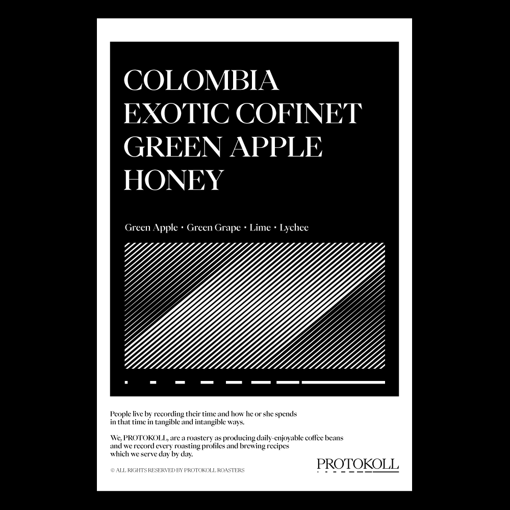 [2026] 청사과와 청포도를 연상하게 하는 산뜻한 향미와 싱그러운 단맛이 어우러지는 커피입니다.라임의 시트러스함과 열대과일 같은 향긋함이 코끝을 스치며 맑고 청아한 계절을 떠올리게 합니다.이처럼 선명한 과일 향미는 새로운 발효 공정과 가공 방식을 연구해 온 코피넷의 실험적인 프로세싱에서 비롯됩니다.80년 동안 콜롬비아 커피를 유통해 온 코피넷은 이국적인 품종을 다채로운 방식으로 가공하는 커피를 선보이고 있습니다.또한 코피넷은 토종 나무 전용 묘목장을 운영하며 어린 묘목을 소규모 재배자들과 나누고 있습니다.이를 통해 지속 가능한 커피 재배 환경을 함께 만들어갑니다. 원산지 Colombia지역 Quindio, Armenia품종 Castillo가공 Honey ASD고도 1,450- 1,500m 커핑노트 Cupping NoteGreen Apple・Green Grape・Lime・Lychee청사과・청포도・라임・리치 브루잉 가이드 레시피프로토콜의 브루잉 레시피입니다. 이 레시피는 원두 고유의 캐릭터를 또렷하게 느낄 수 있도록 전체적인 밸런스가 잘 느껴지도록 제안합니다. 안내된 방법에 따라 추출하시면, 프로토콜이 생각하는 맛있는 한 잔의 흐름을 가장 안정적으로 즐기실 수 있습니다. 하리오 V60 드리퍼를 기준으로 합니다 추출 전 필터지는 뜨거운 물로 충분히 린싱해 종이 향을 제거하고, 안정적인 추출 환경을 만들어 주세요. [HOT]원두는 18g, 물 온도는 94도를 사용합니다. 다음과 같이 물을 부어줍니다.(뜸) 40g – (30초) 100g – (1분) 80g – (1분 30초) 80g 총 300g의 물을 사용하며,대략적으로 2분 30초 내외로 추출이 완료됩니다. [ICE]원두는 20g, 물 온도는 94도를 사용합니다. 드립 서버에 얼음을 8알 정도를 담고 다음과 같이 물을 부어줍니다.(뜸) 40g – (30초) 60g – (1분) 50g – (1분 30초) 50g 총 200g의 물을 사용하며,대략적으로 2분 10초 내외로 추출이 완료됩니다.
