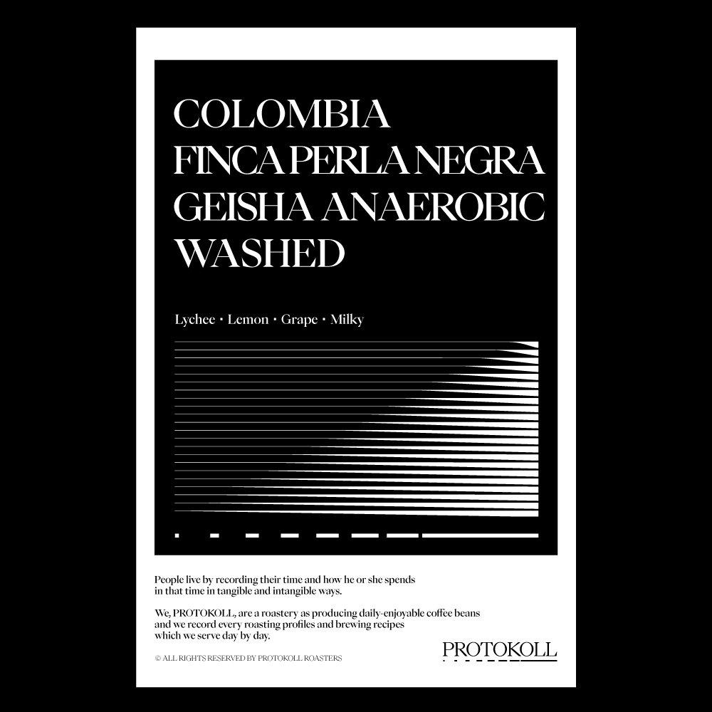 [2025] 잘 익은 커피체리를 수조에서 선별 후 140시간 동안 무산소 발효를 시작합니다.펄핑 후 점액질과 함께 60시간 동안 추가 무산소 발효를 진행합니다.이후 45°C의 물로 30분간 써멀 쇼크하여 발효를 마무리하고 주간에는 아프리칸 베드에서, 야간에는 수분과의 접촉을 피해 그레인프로에서 15일 동안 건조합니다.위처럼 복잡하고 섬세한 과정을 거친 이 커피는 선명하게 느껴지는 리치, 열대과일의 풍미, 시트러스가 조화로운 커피입니다.식을수록 느껴지는 포도를 비롯한 다양한 향미와 밀키한 뉘앙스가 좋은 커피이니 천천히 즐겨보시기 바랍니다. 원산지 Colombia지역 Huila, Finca Perla Negra품종 Gesha가공 Anaerobic Washed고도 1,680 - 1,800m 커핑노트 Cupping NoteLychee • Lemon • Grape • Milky리치 • 레몬 • 포도 • 밀키 브루잉 가이드 레시피프로토콜의 브루잉 레시피입니다. 이 레시피는 원두 고유의 캐릭터를 또렷하게 느낄 수 있도록 전체적인 밸런스가 잘 느껴지도록 제안합니다. 안내된 방법에 따라 추출하시면, 프로토콜이 생각하는 맛있는 한 잔의 흐름을 가장 안정적으로 즐기실 수 있습니다. 하리오 V60 드리퍼를 기준으로 합니다 추출 전 필터지는 뜨거운 물로 충분히 린싱해 종이 향을 제거하고, 안정적인 추출 환경을 만들어 주세요. [HOT]원두는 18g, 물 온도는 94도를 사용합니다. 다음과 같이 물을 부어줍니다.(뜸) 40g – (30초) 100g – (1분) 80g – (1분 30초) 80g 총 300g의 물을 사용하며,대략적으로 2분 30초 내외로 추출이 완료됩니다. [ICE]원두는 20g, 물 온도는 94도를 사용합니다. 드립 서버에 얼음을 8알 정도를 담고 다음과 같이 물을 부어줍니다.(뜸) 40g – (30초) 60g – (1분) 50g – (1분 30초) 50g 총 200g의 물을 사용하며,대략적으로 2분 10초 내외로 추출이 완료됩니다.