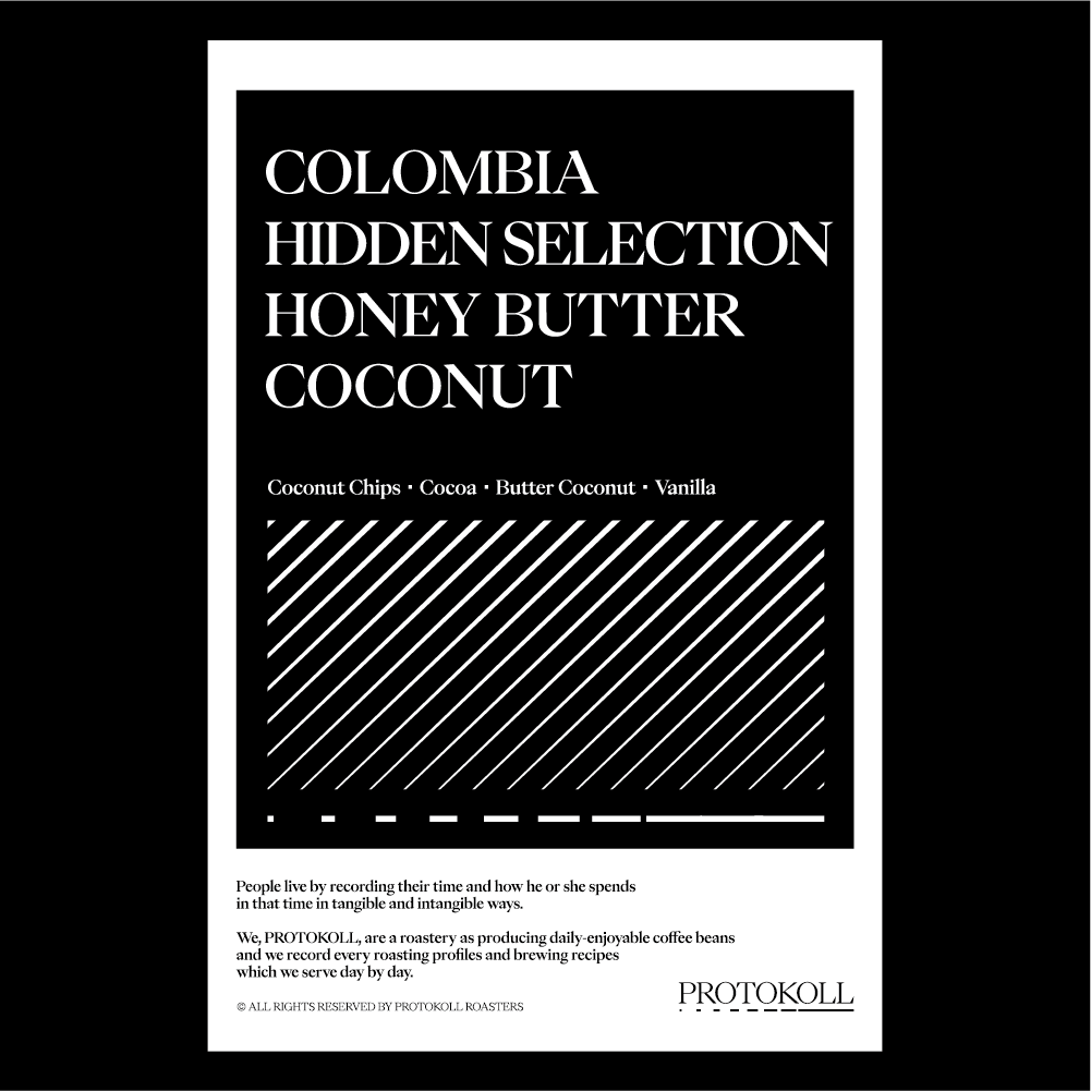 [2024] Grano de Oro 농장의 엘벤 산타나가 재배한 이 커피는 과육이 남아 있는 상태에서 72시간 동안 발효합니다.그리고 펄핑 작업 후 이상적인 수분 함량까지 건조된 코코넛과 함께 드라이 배드에서 건조되는 Dry Anaerobic Fermentation 과정을 거칩니다.그렇게 건조된 커피는 목표 수분 함량이 달성될 때까지 다시 한번 건조된 코코넛과 함께 Grain Pro 백에 보관됩니다.이 커피는 따뜻하게 드시면 코코넛, 코코아, 바닐라의 달콤한 향미를, 차갑게 드시면 청량한 코코넛 워터 같은 뉘앙스를 느끼실 수 있습니다.무엇보다 추억의 비스킷 빠다코코낫'이 연상되는 재미있는 커피일 것입니다.. 원산지 Colombia지역 Quindio, Grano de Oro품종 Castillo가공 Dry Anaerobic Fermentation고도 1,900 - 1,950m 커핑노트 Cupping NotePeach • Floral • Cranberry • Green Apple • Chocolate복숭아 • 플로럴 • 크랜베리 • 청사과 • 초콜릿 브루잉 가이드 레시피프로토콜의 브루잉 레시피입니다. 이 레시피는 원두 고유의 캐릭터를 또렷하게 느낄 수 있도록 전체적인 밸런스가 잘 느껴지도록 제안합니다. 안내된 방법에 따라 추출하시면, 프로토콜이 생각하는 맛있는 한 잔의 흐름을 가장 안정적으로 즐기실 수 있습니다. 하리오 V60 드리퍼를 기준으로 합니다 추출 전 필터지는 뜨거운 물로 충분히 린싱해 종이 향을 제거하고, 안정적인 추출 환경을 만들어 주세요. [HOT]원두는 18g, 물 온도는 94도를 사용합니다. 다음과 같이 물을 부어줍니다.(뜸) 40g – (30초) 100g – (1분) 80g – (1분 30초) 80g 총 300g의 물을 사용하며,대략적으로 2분 30초 내외로 추출이 완료됩니다. [ICE]원두는 20g, 물 온도는 94도를 사용합니다. 드립 서버에 얼음을 8알 정도를 담고 다음과 같이 물을 부어줍니다.(뜸) 40g – (30초) 60g – (1분) 50g – (1분 30초) 50g 총 200g의 물을 사용하며,대략적으로 2분 10초 내외로 추출이 완료됩니다.