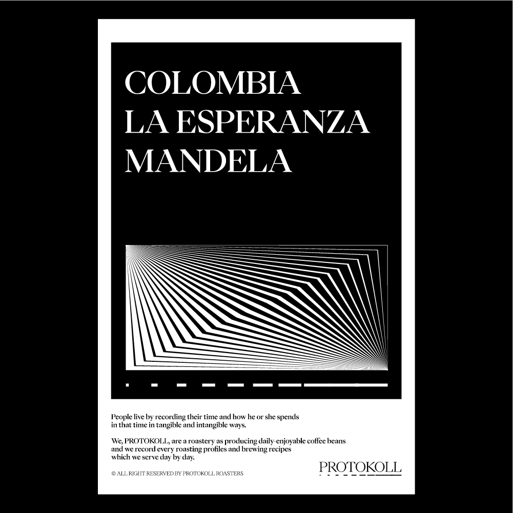 [2022] 이 농장주는 4대째 가업을 이어받아 농장을 운영 중에 있습니다.스페셜티 커피 생산을 위해 지속적인 변화를 추구하며 다양한 품종 개발을 위해 노력하고 있습니다.Mandela는 Colombia, Caturra, Ethiopia의 크로싱 교배를 통해 탄생한 품종입니다.이 커피는 36시간 동안의 발효를 거쳐 곡식 저장소에 다시 35도의 온도로 48시간 동안 저장됩니다.그 후 약 15일 동안 태양에 건조하는 프로세싱의 커피입니다.포도, 라즈베리, 초콜릿 파이 같은 뉘앙스로 다가옵니다.프로토콜 멤버들은 포도맛 웰치스 같다고 표현하기도 합니다. 원산지 Colombia지역 Trujillo, Valle Del Cauca품종 Mandela가공 Anearobic Natural고도 1,430m-1,760m 커핑노트 Cupping NoteRed Grape • Raspberry • Chocolate Pie • Fruit Liqueur적포도 • 라즈베리 • 초콜릿 파이 • 과일 리큐르 브루잉 가이드 레시피프로토콜의 브루잉 레시피입니다. 이 레시피는 원두 고유의 캐릭터를 또렷하게 느낄 수 있도록 전체적인 밸런스가 잘 느껴지도록 제안합니다. 안내된 방법에 따라 추출하시면, 프로토콜이 생각하는 맛있는 한 잔의 흐름을 가장 안정적으로 즐기실 수 있습니다. 하리오 V60 드리퍼를 기준으로 합니다 추출 전 필터지는 뜨거운 물로 충분히 린싱해 종이 향을 제거하고, 안정적인 추출 환경을 만들어 주세요. [HOT]원두는 18g, 물 온도는 94도를 사용합니다. 다음과 같이 물을 부어줍니다.(뜸) 40g – (30초) 100g – (1분) 80g – (1분 30초) 80g 총 300g의 물을 사용하며,대략적으로 2분 30초 내외로 추출이 완료됩니다. [ICE]원두는 20g, 물 온도는 94도를 사용합니다. 드립 서버에 얼음을 8알 정도를 담고 다음과 같이 물을 부어줍니다.(뜸) 40g – (30초) 60g – (1분) 50g – (1분 30초) 50g 총 200g의 물을 사용하며,대략적으로 2분 10초 내외로 추출이 완료됩니다.