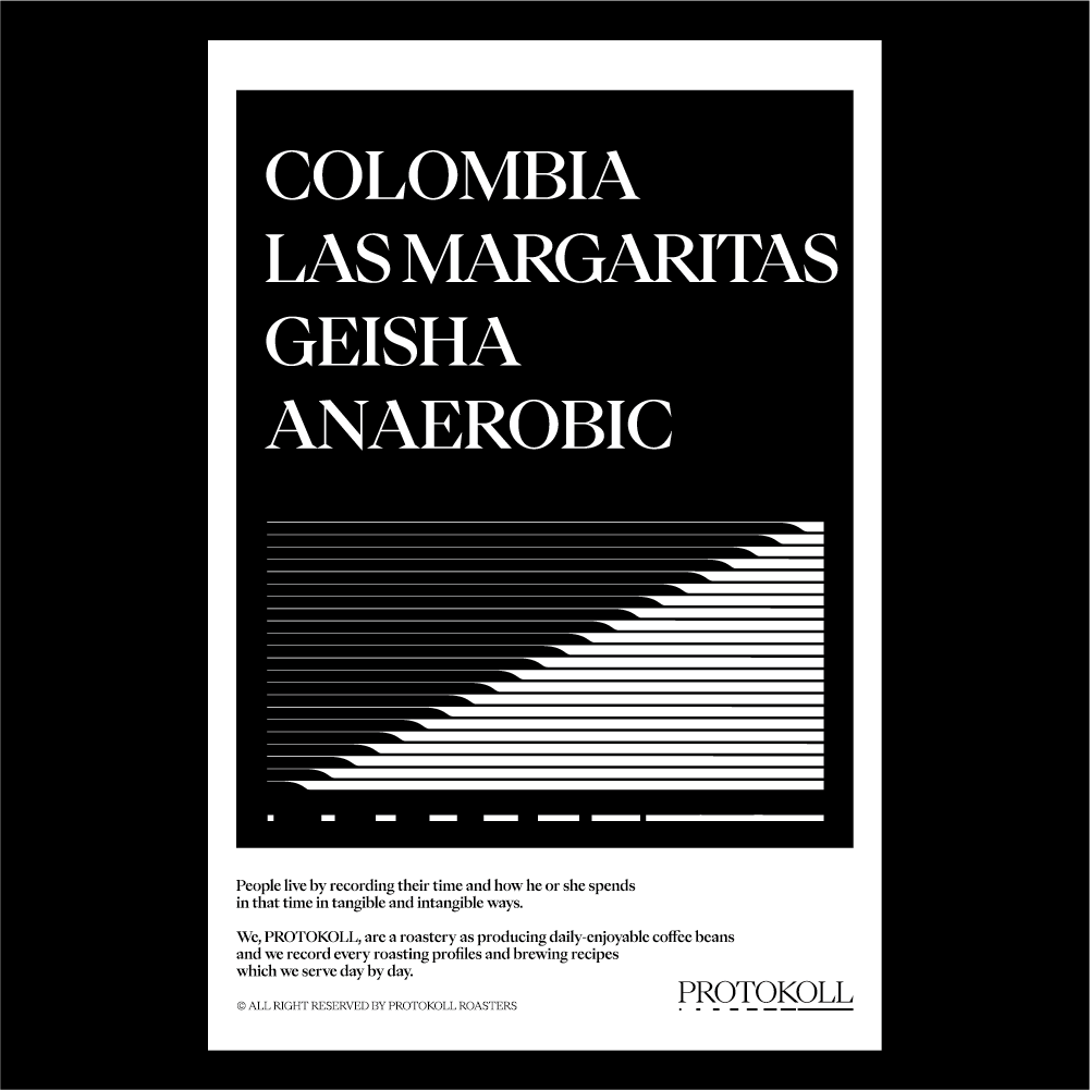 [2022] 4대째 가업을 이어받은 농장주가 관리하는 Las Margaritas 농장은 다양한 품종과 프로세싱을 연구개발하고 있습니다.이 농장은 스페셜티 커피 생산을 위해 매일 지속적으로 환경을 개선하고 변화를 추구하기 위해 항상 노력하고 있습니다.선별된 체리는 밀폐된 탱크에서 96시간 동안 발효된 후 기계식 건조기에서 35도의 온도로 48시간 동안 첫 번째 건조를 진행합니다.1차 건조를 마친 체리는 다시 15일 동안 태양 아래에서 천천히 건조됩니다. 원산지 Colombia지역 Valle del Cauca, Las Margaritas품종 Geisha가공 Anaerobic Natural고도 1,850m 커핑노트 Cupping NoteGrape • Wine • Rose • Tropical Fruit • Bubble Gum포도 • 와인 • 장미 • 열대과일 • 풍선껌 브루잉 가이드 레시피프로토콜의 브루잉 레시피입니다. 이 레시피는 원두 고유의 캐릭터를 또렷하게 느낄 수 있도록 전체적인 밸런스가 잘 느껴지도록 제안합니다. 안내된 방법에 따라 추출하시면, 프로토콜이 생각하는 맛있는 한 잔의 흐름을 가장 안정적으로 즐기실 수 있습니다. 하리오 V60 드리퍼를 기준으로 합니다 추출 전 필터지는 뜨거운 물로 충분히 린싱해 종이 향을 제거하고, 안정적인 추출 환경을 만들어 주세요. [HOT]원두는 18g, 물 온도는 94도를 사용합니다. 다음과 같이 물을 부어줍니다.(뜸) 40g – (30초) 100g – (1분) 80g – (1분 30초) 80g 총 300g의 물을 사용하며,대략적으로 2분 30초 내외로 추출이 완료됩니다. [ICE]원두는 20g, 물 온도는 94도를 사용합니다. 드립 서버에 얼음을 8알 정도를 담고 다음과 같이 물을 부어줍니다.(뜸) 40g – (30초) 60g – (1분) 50g – (1분 30초) 50g 총 200g의 물을 사용하며,대략적으로 2분 10초 내외로 추출이 완료됩니다.