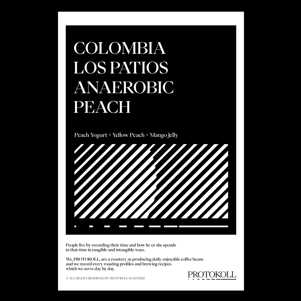 [2025] 콜롬비아 커피를 이야기할 때 다양성을 빼놓을 수 없습니다.같은 커피라도 어느 지역에서 생산됐는지에 따라 특징이 달라지고, 여기에 품종과 프로세싱이 더해지면 경우의 수는 폭발적으로 늘어납니다.이 커피도 이러한 콜롬비아 커피의 다양성을 잘 보여주는 커피 중 하나입니다.커피 체리를 12시간 동안 무산소 발효를 진행, 과육을 제거한 뒤 복숭아 농축액을 추가합니다.이후 48시간 동안 발효를 진행하고 12-16일 동안 건조시킵니다.지속적으로 모니터링하며 균일하게 건조될 수 있게 뒤집어 줍니다.위 과정을 거친 커피는 복숭아 요거트, 황도, 망고젤리 같은 선명한 향미와 단맛이 직관적으로 느껴집니다. 원산지 Colombia지역 Huila, La Plata, Los Patios품종 Blend 가공 Anaerobic (Infused)고도 1,600 - 1,900m 커핑노트 Cupping NotePeach Yogurt • Yello Peach • Mango Jelly복숭아 요거트 • 황도 • 망고젤리 브루잉 가이드 레시피프로토콜의 브루잉 레시피입니다. 이 레시피는 원두 고유의 캐릭터를 또렷하게 느낄 수 있도록 전체적인 밸런스가 잘 느껴지도록 제안합니다. 안내된 방법에 따라 추출하시면, 프로토콜이 생각하는 맛있는 한 잔의 흐름을 가장 안정적으로 즐기실 수 있습니다. 하리오 V60 드리퍼를 기준으로 합니다 추출 전 필터지는 뜨거운 물로 충분히 린싱해 종이 향을 제거하고, 안정적인 추출 환경을 만들어 주세요. [HOT]원두는 18g, 물 온도는 94도를 사용합니다. 다음과 같이 물을 부어줍니다.(뜸) 40g – (30초) 100g – (1분) 80g – (1분 30초) 80g 총 300g의 물을 사용하며,대략적으로 2분 30초 내외로 추출이 완료됩니다. [ICE]원두는 20g, 물 온도는 94도를 사용합니다. 드립 서버에 얼음을 8알 정도를 담고 다음과 같이 물을 부어줍니다.(뜸) 40g – (30초) 60g – (1분) 50g – (1분 30초) 50g 총 200g의 물을 사용하며,대략적으로 2분 10초 내외로 추출이 완료됩니다.