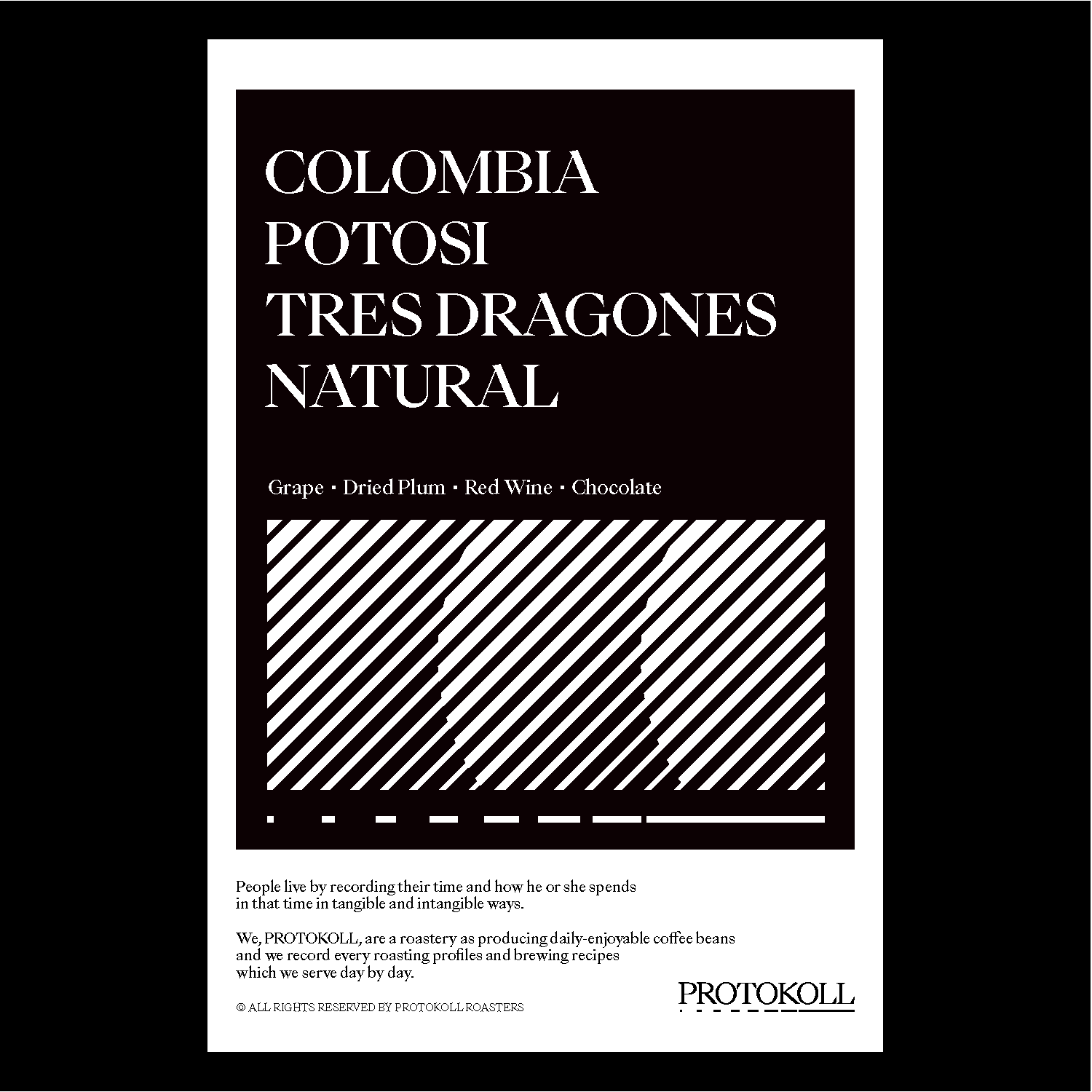 [2024] 콜롬비아의 카페 그랑하라 에스페란자 라는 커피회사가 운영하는 농장 중 가장 큰 면적을 담당하는 포토시 농장의 커피입니다.트레스 드래곤즈라는 이름은 포토시 농장에서 커피를 건조하는 세 개의 용광로에서 유래되었습니다.이 커피 회사의 커피들은 발효를 적극 활용하는 것으로 유명한데 이 커피도 약 50시간 동안 발효, 이후 35°C의 온도로 48시간 동안 저장 보관하고 15일 동안 햇빛에 건조하였습니다.위 과정을 거친 이 커피는 포도주스나 와인을 마시는 듯한 느낌을 주며 초콜릿 같은 후미까지 느껴지는 단맛이 좋은 커피입니다. 원산지 Colombia지역 Calcedonia, Valle Del Cauca품종 Colombia 가공 Natural고도 1,400m - 1,860m 커핑노트 Cupping NoteGrape • Dried Plum • Red Wine • Chocolate포도 • 건자두 • 레드와인 • 초콜릿 브루잉 가이드 레시피프로토콜의 브루잉 레시피입니다. 이 레시피는 원두 고유의 캐릭터를 또렷하게 느낄 수 있도록 전체적인 밸런스가 잘 느껴지도록 제안합니다. 안내된 방법에 따라 추출하시면, 프로토콜이 생각하는 맛있는 한 잔의 흐름을 가장 안정적으로 즐기실 수 있습니다. 하리오 V60 드리퍼를 기준으로 합니다 추출 전 필터지는 뜨거운 물로 충분히 린싱해 종이 향을 제거하고, 안정적인 추출 환경을 만들어 주세요. [HOT]원두는 18g, 물 온도는 94도를 사용합니다. 다음과 같이 물을 부어줍니다.(뜸) 40g – (30초) 100g – (1분) 80g – (1분 30초) 80g 총 300g의 물을 사용하며,대략적으로 2분 30초 내외로 추출이 완료됩니다. [ICE]원두는 20g, 물 온도는 94도를 사용합니다. 드립 서버에 얼음을 8알 정도를 담고 다음과 같이 물을 부어줍니다.(뜸) 40g – (30초) 60g – (1분) 50g – (1분 30초) 50g 총 200g의 물을 사용하며,대략적으로 2분 10초 내외로 추출이 완료됩니다.