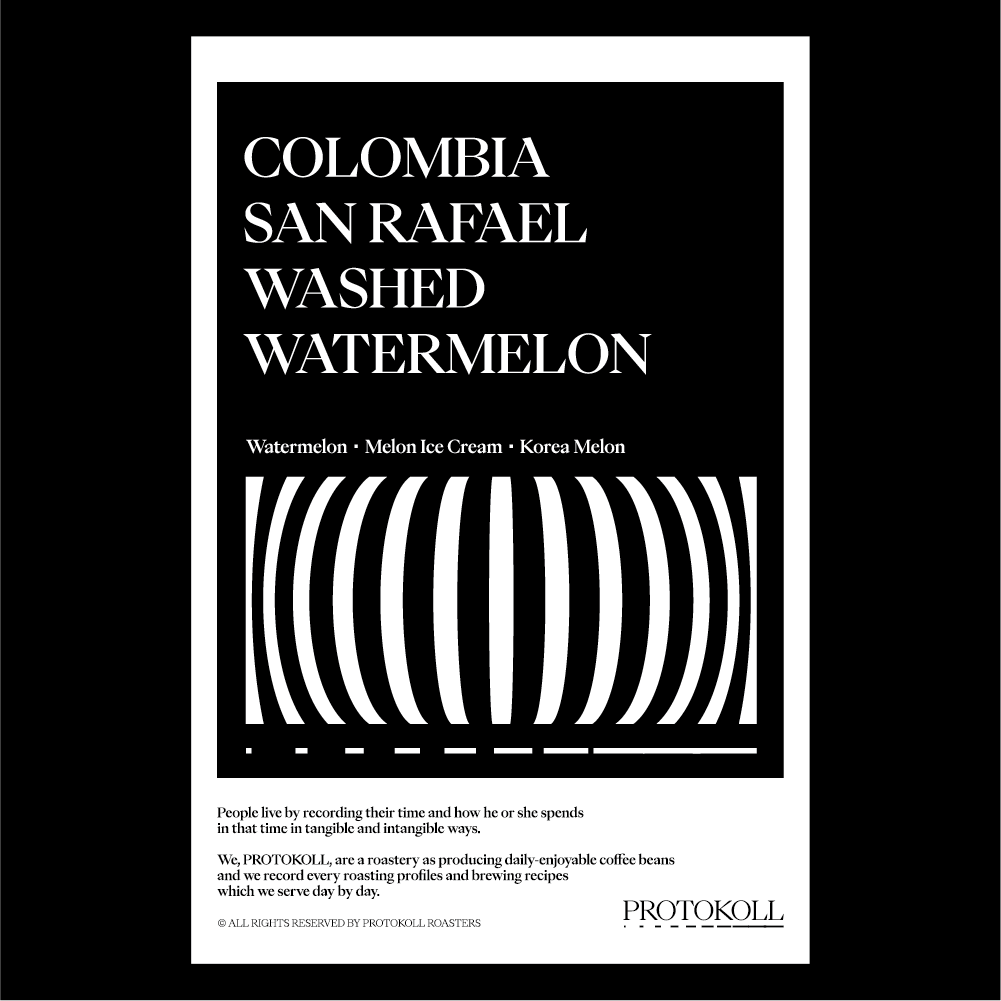 [2024] 산 라파엘 농장이 속해있는 리사랄다 지역은 콜롬비아의 서쪽 중앙에 위치합니다.비옥한 토양, 최적의 기후 및 높은 지대의 지형은 특별한 커피를 재배하기에 이상적인 조건을 제공합니다.유네스코는 이 땅이 생산성과 문화적 경관을 겸비하고 있는 배울 것이 많은 지역이라 평가하여 유네스코의 세계유산으로 등록하였습니다.잘익은 체리만 핸드피킹하여 세심한 분류를 통해 결점두를 걸러냅니다.펄핑 이후 파치먼트 상태로 플라스틱 탱크에서 특별한 향미 프로파일을 유도해주는 효모와 함께 100시간 이하의 발효를 진행하였습니다.이 커피에서는 선명한 수박과 멜론의 향을 느끼실 수 있습니다.특히 차갑게 드셨을 때 아이스크림 수박바나 메로나 같은 익숙한 맛이 재미있는 커피입니다. 원산지 Colombia지역 Risaralda, San Rafael품종 Castillo, Caturra, Bourbon Yeast 가공 Fermentation Washed고도 1,750 - 1,800m 커핑노트 Cupping NoteWatermelon • Watermelon Ice Cream • Melon Ice Cream • Korea Melon수박 • 수박바 • 메로나 • 참외 브루잉 가이드 레시피프로토콜의 브루잉 레시피입니다. 이 레시피는 원두 고유의 캐릭터를 또렷하게 느낄 수 있도록 전체적인 밸런스가 잘 느껴지도록 제안합니다. 안내된 방법에 따라 추출하시면, 프로토콜이 생각하는 맛있는 한 잔의 흐름을 가장 안정적으로 즐기실 수 있습니다. 하리오 V60 드리퍼를 기준으로 합니다 추출 전 필터지는 뜨거운 물로 충분히 린싱해 종이 향을 제거하고, 안정적인 추출 환경을 만들어 주세요. [HOT]원두는 18g, 물 온도는 94도를 사용합니다. 다음과 같이 물을 부어줍니다.(뜸) 40g – (30초) 100g – (1분) 80g – (1분 30초) 80g 총 300g의 물을 사용하며,대략적으로 2분 30초 내외로 추출이 완료됩니다. [ICE]원두는 20g, 물 온도는 94도를 사용합니다. 드립 서버에 얼음을 8알 정도를 담고 다음과 같이 물을 부어줍니다.(뜸) 40g – (30초) 60g – (1분) 50g – (1분 30초) 50g 총 200g의 물을 사용하며,대략적으로 2분 10초 내외로 추출이 완료됩니다.