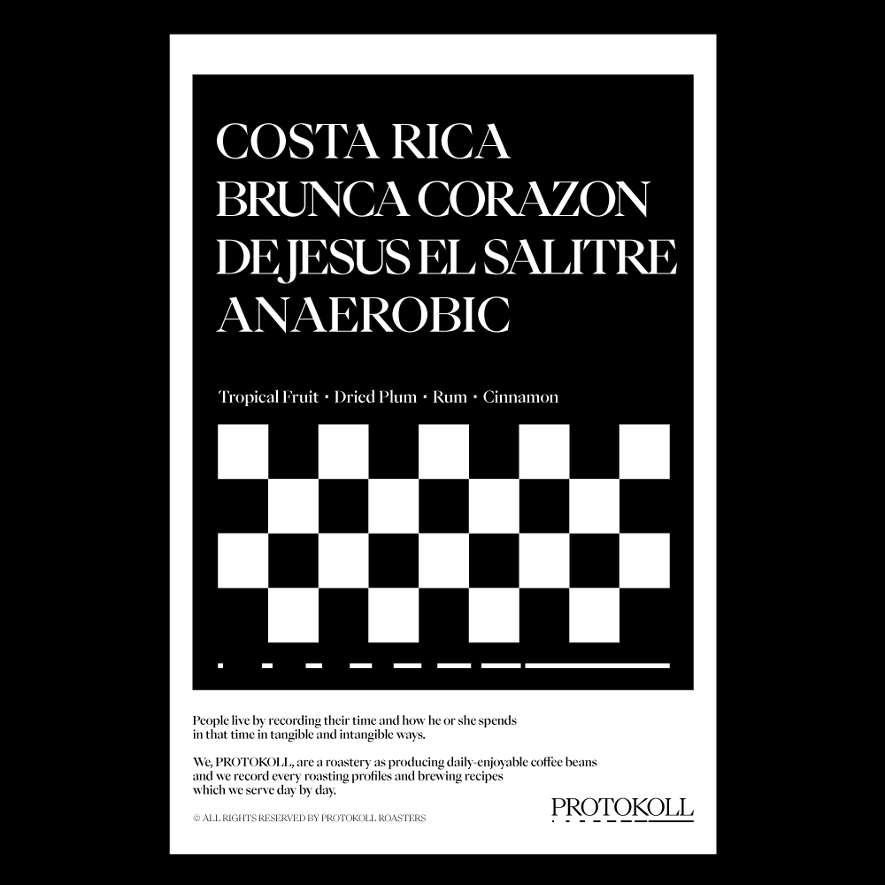 [2025] 코스타리카 남부의 브룬카 지역은 해발 1,850m의 고도와 화산 토양, 뚜렷한 사계절 기후로 티피카 품종의 고유한 특징을 잘 표현해냅니다.이 커피가 재배된 Corazon de Jesus는 '예수님의 심장'이라는 뜻의 농장 이름으로 커피 한 알 한 알에 정성과 축복이 깃들기를 바라는 농부의 진심이 담겨 있습니다.또한, El Salitre는 이 지역의 토양 특성을 드러내는 이름으로, 미네랄이 풍부하고 생명력이 가득한 땅을 상징합니다.이 커피는 체리를 백에 넣어 12시간 동안 초기 발효를, 이후 밀폐된 탱크로 옮겨져 이틀간 2차 발효를 진행하였습니다.마지막으로 건조대로 옮겨 수분을 조절하고 30-45일간 3차 발효를 하며 안정적인 레스팅 과정을 거쳤습니다. 원산지 Costa Rica지역 Brunca, Corazon De Jesus El Salitre품종 Typica가공 Double Natural Anaerobic고도 1,850m 커핑노트 Cupping NoteTropical Fruit • Dried Plum • Rum • Cinnamon열대과일 • 건자두 • 럼 • 시나몬 브루잉 가이드 레시피프로토콜의 브루잉 레시피입니다. 이 레시피는 원두 고유의 캐릭터를 또렷하게 느낄 수 있도록 전체적인 밸런스가 잘 느껴지도록 제안합니다. 안내된 방법에 따라 추출하시면, 프로토콜이 생각하는 맛있는 한 잔의 흐름을 가장 안정적으로 즐기실 수 있습니다. 하리오 V60 드리퍼를 기준으로 합니다 추출 전 필터지는 뜨거운 물로 충분히 린싱해 종이 향을 제거하고, 안정적인 추출 환경을 만들어 주세요. [HOT]원두는 18g, 물 온도는 94도를 사용합니다. 다음과 같이 물을 부어줍니다.(뜸) 40g – (30초) 100g – (1분) 80g – (1분 30초) 80g 총 300g의 물을 사용하며,대략적으로 2분 30초 내외로 추출이 완료됩니다. [ICE]원두는 20g, 물 온도는 94도를 사용합니다. 드립 서버에 얼음을 8알 정도를 담고 다음과 같이 물을 부어줍니다.(뜸) 40g – (30초) 60g – (1분) 50g – (1분 30초) 50g 총 200g의 물을 사용하며,대략적으로 2분 10초 내외로 추출이 완료됩니다.