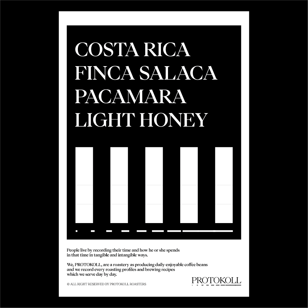 [2023] 살라카 농장은 센트럴 밸리의 서부지역에 위치해 있습니다.이곳은 화산 토양과 비옥한 토양에서 커피를 재배하며 코스타 리카 커피 중 최적의 환경에서 커피를 생산합니다.살라카 농장은 카투라, 카투아이, 비야사치 품종만을 수확하며, 복합적이고 깨끗하고 향기로운 커피를 생산합니다.라이트 허니 프로세싱의 특징 중 하나는 20-30%의 점액질을 남겨두는 것입니다.적게 남아있기 때문에 워시드 프로세싱과 비슷한 뉘앙스를 가지고 있습니다.점액질이 남아있는 상태에서 세척 후 베드에서 15-22일 동안 자연건조합니다.이 커피는 자몽 차, 호두나 땅콩과 같은 견과류의 고소한 맛과 밀크 초콜릿의 단맛을 잘 느끼실 수 있습니다. 원산지 Costa Rica지역 West Valley품종 Pacamara가공 Light Honey고도 1,700m 커핑노트 Cupping NoteGrapefruit • Tangerine • Walnut • Peanut • Milk Chocolate자몽 • 감귤 • 호두 • 땅콩 • 밀크초콜릿 브루잉 가이드 레시피프로토콜의 브루잉 레시피입니다. 이 레시피는 원두 고유의 캐릭터를 또렷하게 느낄 수 있도록 전체적인 밸런스가 잘 느껴지도록 제안합니다. 안내된 방법에 따라 추출하시면, 프로토콜이 생각하는 맛있는 한 잔의 흐름을 가장 안정적으로 즐기실 수 있습니다. 하리오 V60 드리퍼를 기준으로 합니다 추출 전 필터지는 뜨거운 물로 충분히 린싱해 종이 향을 제거하고, 안정적인 추출 환경을 만들어 주세요. [HOT]원두는 18g, 물 온도는 94도를 사용합니다. 다음과 같이 물을 부어줍니다.(뜸) 40g – (30초) 100g – (1분) 80g – (1분 30초) 80g 총 300g의 물을 사용하며,대략적으로 2분 30초 내외로 추출이 완료됩니다. [ICE]원두는 20g, 물 온도는 94도를 사용합니다. 드립 서버에 얼음을 8알 정도를 담고 다음과 같이 물을 부어줍니다.(뜸) 40g – (30초) 60g – (1분) 50g – (1분 30초) 50g 총 200g의 물을 사용하며,대략적으로 2분 10초 내외로 추출이 완료됩니다.