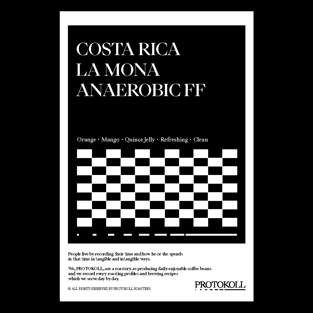 [2024] 이 커피의 프로듀서 안드레스는 인퓨징 커피를 생산하는 데 있어 몇 가지 주요 주제에 중점을 둡니다.좋은 원재료로 시작하여, 식품 안전을 보장하고 생산 세부 사항에 대한 완전한 투명성을 갖춘 커피를 제공하는 것 입니다.수확 후 디펄핑 된 점액질 상태의 파치먼트를 플라스틱 발효통에 넣습니다.거기에 오렌지주스가 추가되고 착즙 후의 오렌지 껍질을 파치먼트와 함께 4-5일간 발효시킵니다.해발고도가 2천미터로 높기 때문에 건조가 느리게 진행됩니다.발효 과정 중의 에너지 발생으로 인한 기온과 압력상승을 조절하기 위해 발효통 뚜껑에는 압력이 빠져나갈 수 있도록 투명한 호스가 연결되어 있고 PH 6~6.5 사이에서 발효를 마감합니다.이후 아프리칸 베드에서 날씨 상황에 따라 2-4주까지 건조됩니다. 건조될 때도 베드 위에 오렌지 껍질은 함께 있습니다. 창고에 옮겨진 파치먼트는 또 다시 한 달여의 시간 동안 에이징을 하고 포장됩니다.위 과정을 거쳐 탄생한 이 커피는 과하지 않은 향과 자연스러운 맛들이 이어집니다.오렌지를 비롯하여 노란색 계열의 모과, 망고 같은 뉘앙스로 채워져 있는 산뜻함이 좋은 커피입니다. 원산지 Costa Rica지역 Tarrazú, Santa Maria De Dota품종 Caturra, Catuai 가공 Anaerobic Fruit Fermentation고도 1,700 - 1,800m 커핑노트 Cupping NoteOrange • Mango • Quince Jelly • Refreshing • Clean오렌지 • 망고 • 모과 젤리 • 산뜻함 • 깔끔함 브루잉 가이드 레시피프로토콜의 브루잉 레시피입니다. 이 레시피는 원두 고유의 캐릭터를 또렷하게 느낄 수 있도록 전체적인 밸런스가 잘 느껴지도록 제안합니다. 안내된 방법에 따라 추출하시면, 프로토콜이 생각하는 맛있는 한 잔의 흐름을 가장 안정적으로 즐기실 수 있습니다. 하리오 V60 드리퍼를 기준으로 합니다 추출 전 필터지는 뜨거운 물로 충분히 린싱해 종이 향을 제거하고, 안정적인 추출 환경을 만들어 주세요. [HOT]원두는 18g, 물 온도는 94도를 사용합니다. 다음과 같이 물을 부어줍니다.(뜸) 40g – (30초) 100g – (1분) 80g – (1분 30초) 80g 총 300g의 물을 사용하며,대략적으로 2분 30초 내외로 추출이 완료됩니다. [ICE]원두는 20g, 물 온도는 94도를 사용합니다. 드립 서버에 얼음을 8알 정도를 담고 다음과 같이 물을 부어줍니다.(뜸) 40g – (30초) 60g – (1분) 50g – (1분 30초) 50g 총 200g의 물을 사용하며,대략적으로 2분 10초 내외로 추출이 완료됩니다.