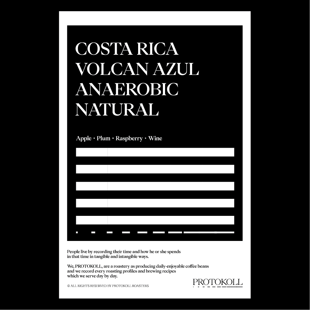 [2024] Volcan Azul은 해발 1,500m 이상에 위치한 농장으로, 19세기부터 현재까지 5대째 내려오는 전통을 자랑합니다.비옥한 화산 토양과 따뜻한 날씨가 뛰어난 품질의 커피를 생산하기 적합해 다양한 품종을 심고 있습니다.또한 이 농장은 체리를 5일 동안 탱크에 넣은 후 12일간 천천히 건조하는 등 특별한 가공 방식을 꾸준히 연구하고 있습니다.그 결과로 2017년 COE 2위, 2018년 COE 34위, 그리고 2020년 COE 4위와 12위를 수상하였습니다.이 커피는 사과, 자두, 라즈베리와 같은 빨간색 계열의 과일들이 잘 연상됩니다.기존 코스타리카 커피에서 연상되는 혹은 프로토콜에서 다양하게 선보인 언에어로빅 커피들에 비해 조금 더 깔끔하고 선명한 뉘앙스의 커피일 것입니다. 원산지 Costa Rica지역 West Velly, Volcan Azul품종 Ethiopian가공 Anaerobic Natural고도 1,500m 커핑노트 Cupping NoteApple • Plum • Raspberry • Wine사과 • 자두 • 라즈베리 • 와인 브루잉 가이드 레시피프로토콜의 브루잉 레시피입니다. 이 레시피는 원두 고유의 캐릭터를 또렷하게 느낄 수 있도록 전체적인 밸런스가 잘 느껴지도록 제안합니다. 안내된 방법에 따라 추출하시면, 프로토콜이 생각하는 맛있는 한 잔의 흐름을 가장 안정적으로 즐기실 수 있습니다. 하리오 V60 드리퍼를 기준으로 합니다 추출 전 필터지는 뜨거운 물로 충분히 린싱해 종이 향을 제거하고, 안정적인 추출 환경을 만들어 주세요. [HOT]원두는 18g, 물 온도는 94도를 사용합니다. 다음과 같이 물을 부어줍니다.(뜸) 40g – (30초) 100g – (1분) 80g – (1분 30초) 80g 총 300g의 물을 사용하며,대략적으로 2분 30초 내외로 추출이 완료됩니다. [ICE]원두는 20g, 물 온도는 94도를 사용합니다. 드립 서버에 얼음을 8알 정도를 담고 다음과 같이 물을 부어줍니다.(뜸) 40g – (30초) 60g – (1분) 50g – (1분 30초) 50g 총 200g의 물을 사용하며,대략적으로 2분 10초 내외로 추출이 완료됩니다.