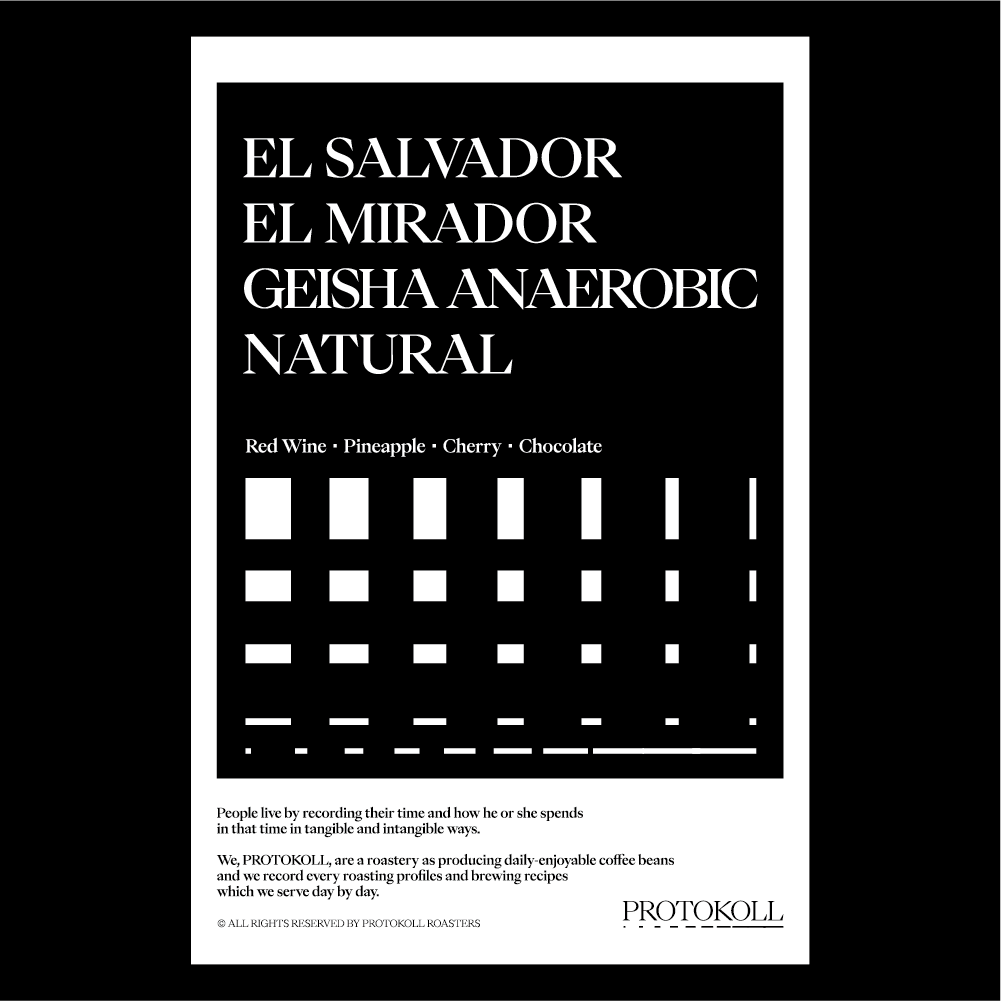 [2024] 엘살바도르 지역은 화산지형에서 나오는 풍부한 무기질과 높은 일교차로 커피 재배에 최적화된 요소를 갖추고 있습니다.오랜 시간 이어진 내전으로 커피 산업이 크게 위축 되기도 하였지만, 1992년 내전을 끝으로 "CAFENILATINO" 프로젝트를 진행하며 COE 등 대회에 참가, 양질의 품질을 생산하고 홍보하는데 노력하고 있습니다.엘 미라도르는 1875년 경, 스페인 식민지 가정의 후손들이 만들었습니다.현 농장주 Roberto는 오랜 시간 방치되어 있던 농장의 일부를 15년 전부터 구입하기 시작했으며, 수년간의 농장 복원작업과 헌신 끝에6년 전부터 COE 대회에서 우수한 결과를 내며 성과를 보이고 있습니다.프로토콜에서 선보이고 있는 2023 엘살바도르 COE #10과 #30은 같은 지역, 같은 품종, 다른 프로세싱의 커피입니다.두 커피를 비교해 드셔 보셔도 재미있을 것입니다. 원산지 El Salvador지역 La Argentina Huila, El Mirador품종 Geisha가공 Anaerobic Natural고도 1,660m 커핑노트 Cupping NoteRed Wine • Pineapple • Cherry • Chocolate레드 와인 • 파인애플 • 체리 • 초콜릿 브루잉 가이드 레시피프로토콜의 브루잉 레시피입니다. 이 레시피는 원두 고유의 캐릭터를 또렷하게 느낄 수 있도록 전체적인 밸런스가 잘 느껴지도록 제안합니다. 안내된 방법에 따라 추출하시면, 프로토콜이 생각하는 맛있는 한 잔의 흐름을 가장 안정적으로 즐기실 수 있습니다. 하리오 V60 드리퍼를 기준으로 합니다 추출 전 필터지는 뜨거운 물로 충분히 린싱해 종이 향을 제거하고, 안정적인 추출 환경을 만들어 주세요. [HOT]원두는 18g, 물 온도는 94도를 사용합니다. 다음과 같이 물을 부어줍니다.(뜸) 40g – (30초) 100g – (1분) 80g – (1분 30초) 80g 총 300g의 물을 사용하며,대략적으로 2분 30초 내외로 추출이 완료됩니다. [ICE]원두는 20g, 물 온도는 94도를 사용합니다. 드립 서버에 얼음을 8알 정도를 담고 다음과 같이 물을 부어줍니다.(뜸) 40g – (30초) 60g – (1분) 50g – (1분 30초) 50g 총 200g의 물을 사용하며,대략적으로 2분 10초 내외로 추출이 완료됩니다.