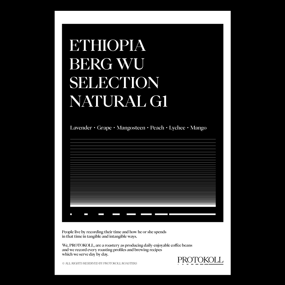 [2026] 라벤더의 잔잔한 플로럴로 시작해 포도와 망고스틴의 짙은 과실감, 복숭아와 리치의 달콤한 과육과 같은 뉘앙스가 자연스럽게 연결되며 긴 여운 남깁니다.복합적이면서도 밀도 있는 향미가 특징입니다.해발 2,200m 이상의 고지대에서 재배된 체리를 장기간 내추럴 방식으로 건조하며, 수분율과 선별을 철저히 관리해 풍부한 향미 성분을 안정적으로 이끌어냈습니다.2016 WBC 챔피언 Berg Wu가 직접 참여한 World Champion Series 커피로 구지 지역의 잠재력을 집약한 대표적인 내추럴 셀렉션입니다. 원산지 Ethiopia지역 Guji, Hambella Wamena품종 Heirloom가공 Natural고도 2,200 - 2,330m 커핑노트 Cupping NoteLavender・Grape・Mangosteen・Peach・Lychee・Mango라벤더・포도・망고스틴・복숭아・리치・망고 브루잉 가이드 레시피프로토콜의 브루잉 레시피입니다. 이 레시피는 원두 고유의 캐릭터를 또렷하게 느낄 수 있도록 전체적인 밸런스가 잘 느껴지도록 제안합니다. 안내된 방법에 따라 추출하시면, 프로토콜이 생각하는 맛있는 한 잔의 흐름을 가장 안정적으로 즐기실 수 있습니다. 하리오 V60 드리퍼를 기준으로 합니다 추출 전 필터지는 뜨거운 물로 충분히 린싱해 종이 향을 제거하고, 안정적인 추출 환경을 만들어 주세요. [HOT]원두는 18g, 물 온도는 94도를 사용합니다. 다음과 같이 물을 부어줍니다.(뜸) 40g – (30초) 100g – (1분) 80g – (1분 30초) 80g 총 300g의 물을 사용하며,대략적으로 2분 30초 내외로 추출이 완료됩니다. [ICE]원두는 20g, 물 온도는 94도를 사용합니다. 드립 서버에 얼음을 8알 정도를 담고 다음과 같이 물을 부어줍니다.(뜸) 40g – (30초) 60g – (1분) 50g – (1분 30초) 50g 총 200g의 물을 사용하며,대략적으로 2분 10초 내외로 추출이 완료됩니다.
