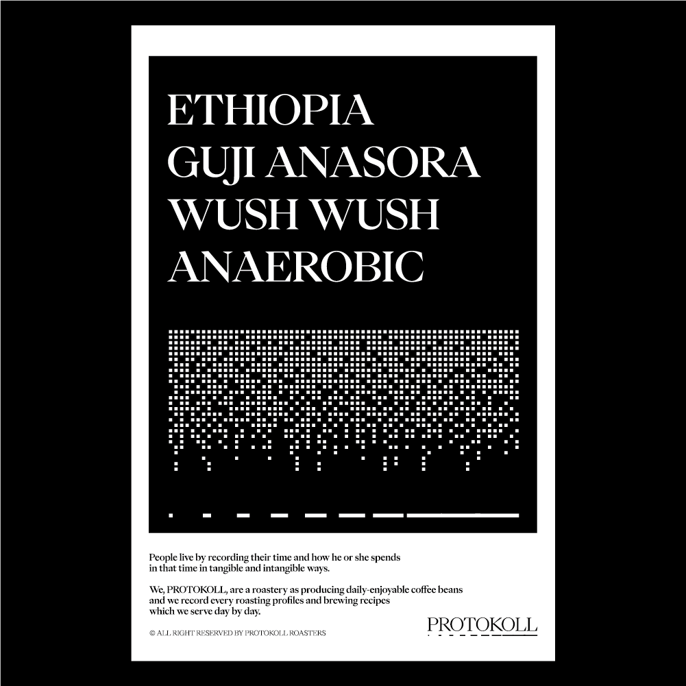 [2025] 120시간의 장시간 발효를 진행하는 동안 매우 섬세하게 관리된 특별한 커스터마이징 랏입니다.에티오피아 원종 중 하나인 우쉬우쉬 품종만을 모아 무산소 발효를 거쳐 내추럴 프로세싱으로 마무리하여 폭발적인 향미를 지닌 생두입니다.'Fruit Wine Bomb' 이라는 별명을 가지고 있지만 프로토콜에서 느끼기에는 포도, 자두같은 과일의 향미를 바탕으로 럼에 더 가까운 뉘앙스로 다가옵니다. 원산지 Ethiopia지역 Guji Zone, Anasora Woreda품종 Wush Wush가공 Anaerobic Natural고도 2,250m 커핑노트 Cupping NoteRum • Grape • Plum • Blackberry백럼 • 포도 • 자두 • 블랙베리 브루잉 가이드 레시피프로토콜의 브루잉 레시피입니다. 이 레시피는 원두 고유의 캐릭터를 또렷하게 느낄 수 있도록 전체적인 밸런스가 잘 느껴지도록 제안합니다. 안내된 방법에 따라 추출하시면, 프로토콜이 생각하는 맛있는 한 잔의 흐름을 가장 안정적으로 즐기실 수 있습니다. 하리오 V60 드리퍼를 기준으로 합니다 추출 전 필터지는 뜨거운 물로 충분히 린싱해 종이 향을 제거하고, 안정적인 추출 환경을 만들어 주세요. [HOT]원두는 18g, 물 온도는 94도를 사용합니다. 다음과 같이 물을 부어줍니다.(뜸) 40g – (30초) 100g – (1분) 80g – (1분 30초) 80g 총 300g의 물을 사용하며,대략적으로 2분 30초 내외로 추출이 완료됩니다. [ICE]원두는 20g, 물 온도는 94도를 사용합니다. 드립 서버에 얼음을 8알 정도를 담고 다음과 같이 물을 부어줍니다.(뜸) 40g – (30초) 60g – (1분) 50g – (1분 30초) 50g 총 200g의 물을 사용하며,대략적으로 2분 10초 내외로 추출이 완료됩니다.