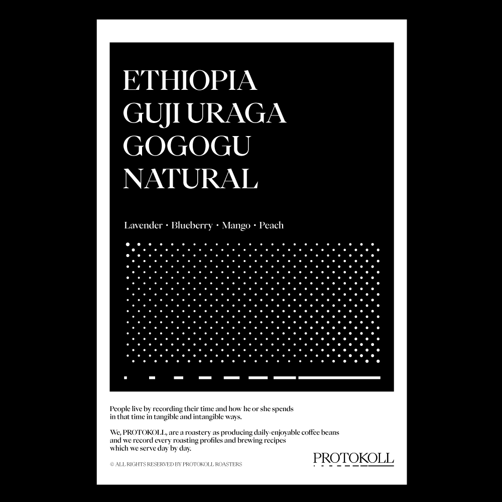 [2025] 구지 지역의 울창한 고지대, 해발 2,000m가 넘는 우라가의 숲 속 마을 고고구에서는 커피 체리가 천천히 익으며 더 복합적인 당과 산미를 형성할 수 있는 조건을 갖추고 있습니다.체리는 수확 후 아프리칸 베드에서 15-20일간 천천히 건조되며, 정기적으로 뒤집어 과발효를 방지함으로써 깔끔함을 균형 있게 유지합니다.이 커피는 라벤더의 향미를 시작으로 블루베리, 망고, 복숭아 등 복합적인 뉘앙스가 좋은 커피입니다. 원산지 Ethiopia지역 Guji, Uraga, Gogogu품종 Heirloom가공 Natural고도 2,300m 커핑노트 Cupping NoteLavender • Blueberry • Mango • Peach라벤더 • 블루베리 • 망고 • 피치 브루잉 가이드 레시피프로토콜의 브루잉 레시피입니다. 이 레시피는 원두 고유의 캐릭터를 또렷하게 느낄 수 있도록 전체적인 밸런스가 잘 느껴지도록 제안합니다. 안내된 방법에 따라 추출하시면, 프로토콜이 생각하는 맛있는 한 잔의 흐름을 가장 안정적으로 즐기실 수 있습니다. 하리오 V60 드리퍼를 기준으로 합니다 추출 전 필터지는 뜨거운 물로 충분히 린싱해 종이 향을 제거하고, 안정적인 추출 환경을 만들어 주세요. [HOT]원두는 18g, 물 온도는 94도를 사용합니다. 다음과 같이 물을 부어줍니다.(뜸) 40g – (30초) 100g – (1분) 80g – (1분 30초) 80g 총 300g의 물을 사용하며,대략적으로 2분 30초 내외로 추출이 완료됩니다. [ICE]원두는 20g, 물 온도는 94도를 사용합니다. 드립 서버에 얼음을 8알 정도를 담고 다음과 같이 물을 부어줍니다.(뜸) 40g – (30초) 60g – (1분) 50g – (1분 30초) 50g 총 200g의 물을 사용하며,대략적으로 2분 10초 내외로 추출이 완료됩니다.