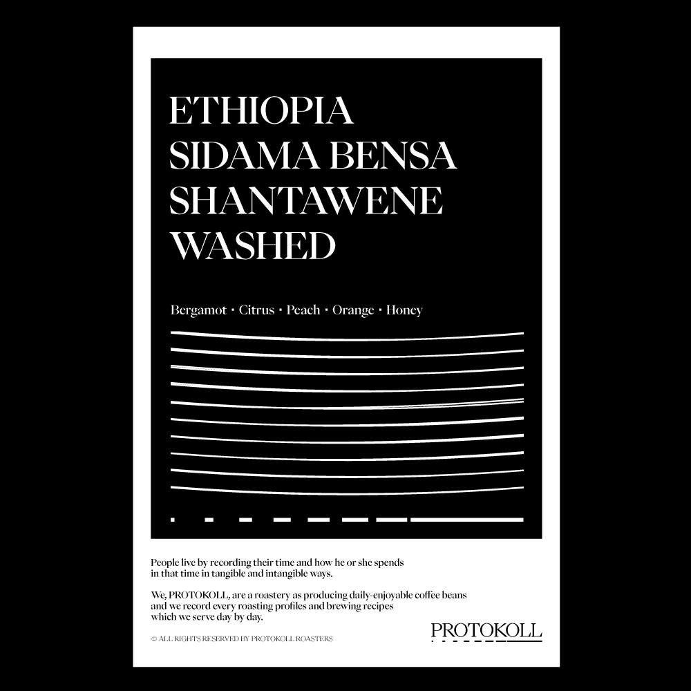 [2025] 에티오피아 남부 지역 시다마에 위치한 Bensa는 높은 퀄리티로 유명한 Yirgacheffe(예가체프), Guji(구지)와 인접해있습니다.비옥한 토양, 풍부한 강수량 등 양질의 커피 생산에 적합한 환경이 조성되어 있으며, 특히 높은 해발고도에 위치해 있어 이곳의 커피 열매는 열대과일의 향미와 섬세한 단맛이 매력적입니다.프로토콜이 애정하는 에티오피아 워시드 커피를 비교적 오랜만에 소개합니다.이 커피는 좋은 에티오피아 워시드 커피가 갖춰야 할 베르가못, 복숭아, 오렌지 같은 향미와 단맛이 잘 나타납니다. 원산지 Ethiopia지역 Sidama, Bensa, Shantawene품종 Heirloom가공 Washed고도 1,500 - 2,000m 커핑노트 Cupping NoteBergamot • Citrus • Peach • Orange • Honey베르가못 • 시트러스 • 피치 • 오렌지 • 꿀 브루잉 가이드 레시피프로토콜의 브루잉 레시피입니다. 이 레시피는 원두 고유의 캐릭터를 또렷하게 느낄 수 있도록 전체적인 밸런스가 잘 느껴지도록 제안합니다. 안내된 방법에 따라 추출하시면, 프로토콜이 생각하는 맛있는 한 잔의 흐름을 가장 안정적으로 즐기실 수 있습니다. 하리오 V60 드리퍼를 기준으로 합니다 추출 전 필터지는 뜨거운 물로 충분히 린싱해 종이 향을 제거하고, 안정적인 추출 환경을 만들어 주세요. [HOT]원두는 18g, 물 온도는 94도를 사용합니다. 다음과 같이 물을 부어줍니다.(뜸) 40g – (30초) 100g – (1분) 80g – (1분 30초) 80g 총 300g의 물을 사용하며,대략적으로 2분 30초 내외로 추출이 완료됩니다. [ICE]원두는 20g, 물 온도는 94도를 사용합니다. 드립 서버에 얼음을 8알 정도를 담고 다음과 같이 물을 부어줍니다.(뜸) 40g – (30초) 60g – (1분) 50g – (1분 30초) 50g 총 200g의 물을 사용하며,대략적으로 2분 10초 내외로 추출이 완료됩니다.