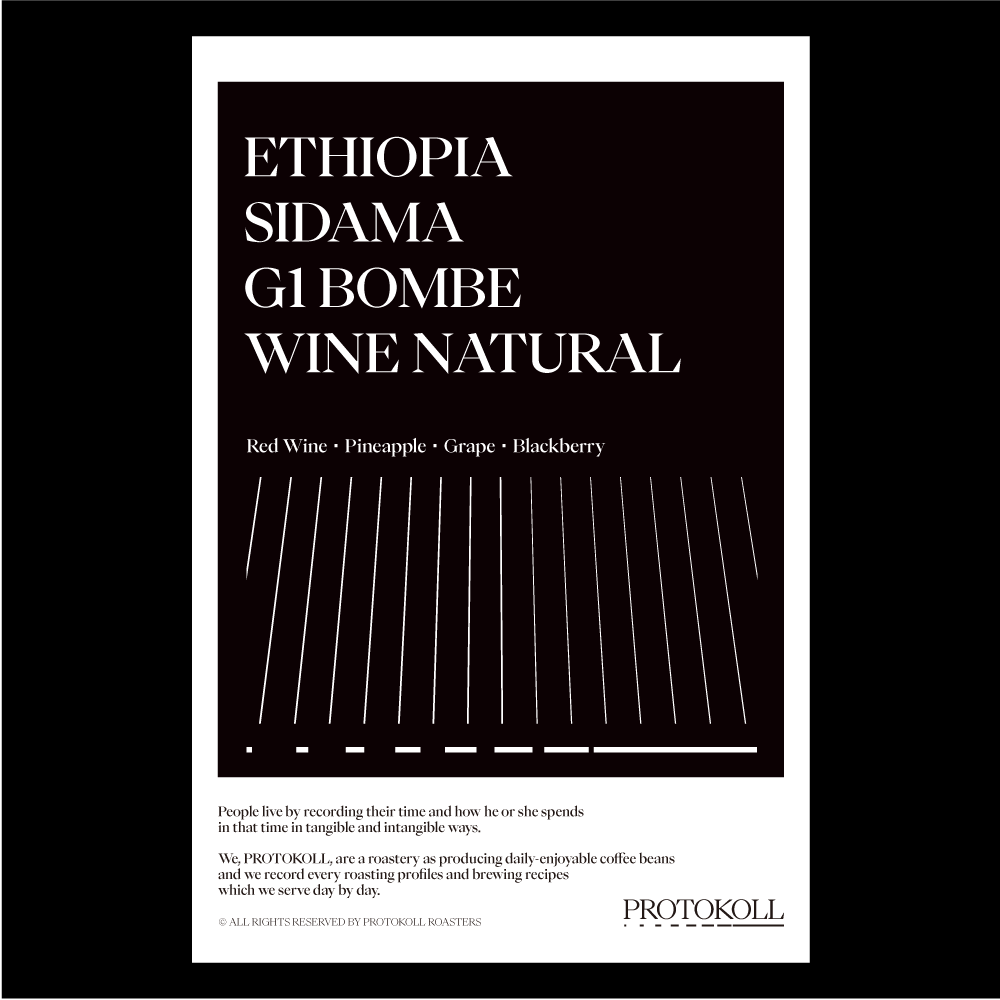 [2024] 이 커피는 에티오피아 남부 지역 도시 Sidama에서 재배되었습니다.고당도 커피 체리만을 선별하여 스테인리스스틸탱크에 넣어 완전히 밀봉 후 며칠동안 발효시킵니다.이 과정에서 압력으로 인해 점액질의 쥬시한 맛이 커피에 스며들게 됩니다.탱크에서 꺼낸 후에는 아프리칸베드에서 15-18일동안 건조시킵니다.위 프로세스를 거친 이 커피는 차갑게 드시면 포도같은 상큼한 산미가, 따듯하게 드시면 블랙베리나 와인처럼 더 묵직한 뉘앙스의 단맛이 느껴지는 커피입니다. 원산지 Ethiopia지역 Sidama Bensa Bombe품종 Kumie, Diga & Wilsho 가공 Wine Natural고도 1,860 - 1,990m 커핑노트 Cupping NoteRed wine・Pineapple・Grape・Blackberry레드와인・파인애플・포도・블랙베리 브루잉 가이드 레시피프로토콜의 브루잉 레시피입니다. 이 레시피는 원두 고유의 캐릭터를 또렷하게 느낄 수 있도록 전체적인 밸런스가 잘 느껴지도록 제안합니다. 안내된 방법에 따라 추출하시면, 프로토콜이 생각하는 맛있는 한 잔의 흐름을 가장 안정적으로 즐기실 수 있습니다. 하리오 V60 드리퍼를 기준으로 합니다 추출 전 필터지는 뜨거운 물로 충분히 린싱해 종이 향을 제거하고, 안정적인 추출 환경을 만들어 주세요. [HOT]원두는 18g, 물 온도는 94도를 사용합니다. 다음과 같이 물을 부어줍니다.(뜸) 40g – (30초) 100g – (1분) 80g – (1분 30초) 80g 총 300g의 물을 사용하며,대략적으로 2분 30초 내외로 추출이 완료됩니다. [ICE]원두는 20g, 물 온도는 94도를 사용합니다. 드립 서버에 얼음을 8알 정도를 담고 다음과 같이 물을 부어줍니다.(뜸) 40g – (30초) 60g – (1분) 50g – (1분 30초) 50g 총 200g의 물을 사용하며,대략적으로 2분 10초 내외로 추출이 완료됩니다.