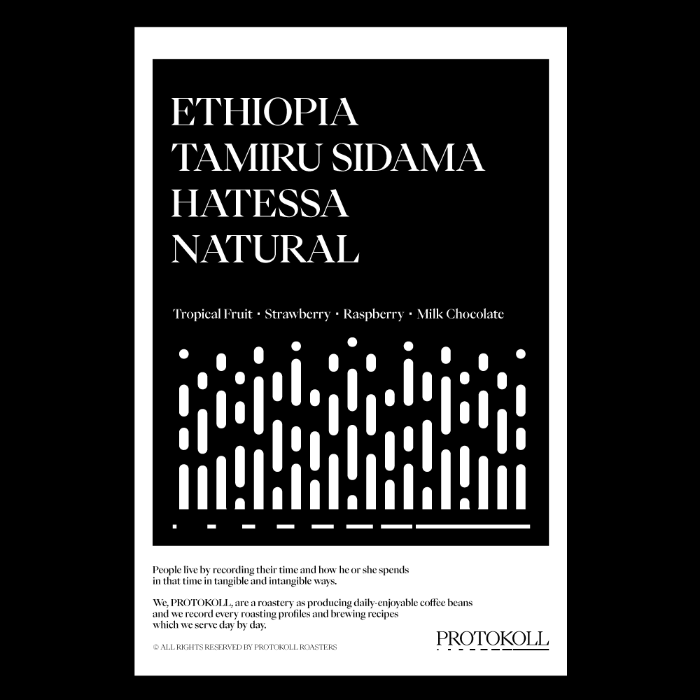 [2025] 2021년 에티오피아 컵 오브 엑셀런스(CoE)에서 1위와 5위를 수상, 다양한 프로세싱을 디테일하게 관리하며 높은 퀄리티를 자부하는타미루 농장에서 생산한 커피입니다. 타미루의 농장은 해발 2,480m에 달하는 고지대에 위치해 있으며 주로 74158 품종의 커피를 재배합니다.체리를 수확한 이후 아프리칸 베드에 2시간마다 한 번씩 체리를 뒤집어주면서 수분율 10-11% 이하가 될 때까지 천천히 건조하여 완성합니다.완성된 생두는 2달간 창고에서 충분한 레스팅 과정을 거칩니다.이 커피는 에티오피아 내추럴 커피의 전형적인 뉘앙스가 잘 드러납니다.복합적인 과일의 향미와 뛰어난 클린컵이 인상적입니다. 원산지 Ethiopia지역 Sidama, Bensa, Tamiru품종 74518가공 Natural고도 2,250 - 2,480m 커핑노트 Cupping NoteTropical Fruit • Strawberry • Raspberry • Milk Chocolate열대과일 • 딸기• 라즈베리 • 밀크 초콜릿 브루잉 가이드 레시피프로토콜의 브루잉 레시피입니다. 이 레시피는 원두 고유의 캐릭터를 또렷하게 느낄 수 있도록 전체적인 밸런스가 잘 느껴지도록 제안합니다. 안내된 방법에 따라 추출하시면, 프로토콜이 생각하는 맛있는 한 잔의 흐름을 가장 안정적으로 즐기실 수 있습니다. 하리오 V60 드리퍼를 기준으로 합니다 추출 전 필터지는 뜨거운 물로 충분히 린싱해 종이 향을 제거하고, 안정적인 추출 환경을 만들어 주세요. [HOT]원두는 18g, 물 온도는 94도를 사용합니다. 다음과 같이 물을 부어줍니다.(뜸) 40g – (30초) 100g – (1분) 80g – (1분 30초) 80g 총 300g의 물을 사용하며,대략적으로 2분 30초 내외로 추출이 완료됩니다. [ICE]원두는 20g, 물 온도는 94도를 사용합니다. 드립 서버에 얼음을 8알 정도를 담고 다음과 같이 물을 부어줍니다.(뜸) 40g – (30초) 60g – (1분) 50g – (1분 30초) 50g 총 200g의 물을 사용하며,대략적으로 2분 10초 내외로 추출이 완료됩니다.