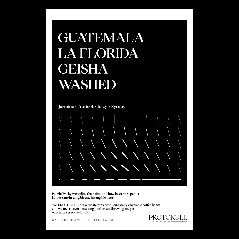 [2024] La Florida는 라스 미나스 산맥(Las Minas Mountain Ridge) 중심부의 숲으로 둘러싸인 아열대 기후에 자리 잡고 있습니다.4대에 걸쳐 커피 심기, 재배, 수확, 가공 기술이 각 가족 구성원에게 전해졌으며 이것이 바로 La Florida 농장이 수년 동안 맛, 향, 산도의 완벽함을 유지할 수 있는 이유입니다.또한 환경개선을 위해 태양열 건조기, 물 재활용, 사용한 물 처리, 지렁이 퇴비 공정 등 에너지, 물 및 폐기물 관리에 있어서도 지속적으로 노력을 기울이고 있습니다.프로토콜이 좋아하는 또 게이샤 워시드입니다.프로토콜의 로스터와 바리스타는 게이샤 워시드를 정말 좋아하는데요, 이 커피 역시 게이샤 품종만이 가지고 있는 재스민 티, 살구 주스 같은 느낌이 좋은 커피입니다. 원산지 Guatemala지역 El Progreso La Florida품종 Geisha가공 Washed고도 1,600 - 1,800m 커핑노트 Cupping NoteJasmine • Apricot • Juicy • Syrupy재스민 • 살구 • 주시 • 시러피 브루잉 가이드 레시피프로토콜의 브루잉 레시피입니다. 이 레시피는 원두 고유의 캐릭터를 또렷하게 느낄 수 있도록 전체적인 밸런스가 잘 느껴지도록 제안합니다. 안내된 방법에 따라 추출하시면, 프로토콜이 생각하는 맛있는 한 잔의 흐름을 가장 안정적으로 즐기실 수 있습니다. 하리오 V60 드리퍼를 기준으로 합니다 추출 전 필터지는 뜨거운 물로 충분히 린싱해 종이 향을 제거하고, 안정적인 추출 환경을 만들어 주세요. [HOT]원두는 18g, 물 온도는 94도를 사용합니다. 다음과 같이 물을 부어줍니다.(뜸) 40g – (30초) 100g – (1분) 80g – (1분 30초) 80g 총 300g의 물을 사용하며,대략적으로 2분 30초 내외로 추출이 완료됩니다. [ICE]원두는 20g, 물 온도는 94도를 사용합니다. 드립 서버에 얼음을 8알 정도를 담고 다음과 같이 물을 부어줍니다.(뜸) 40g – (30초) 60g – (1분) 50g – (1분 30초) 50g 총 200g의 물을 사용하며,대략적으로 2분 10초 내외로 추출이 완료됩니다.