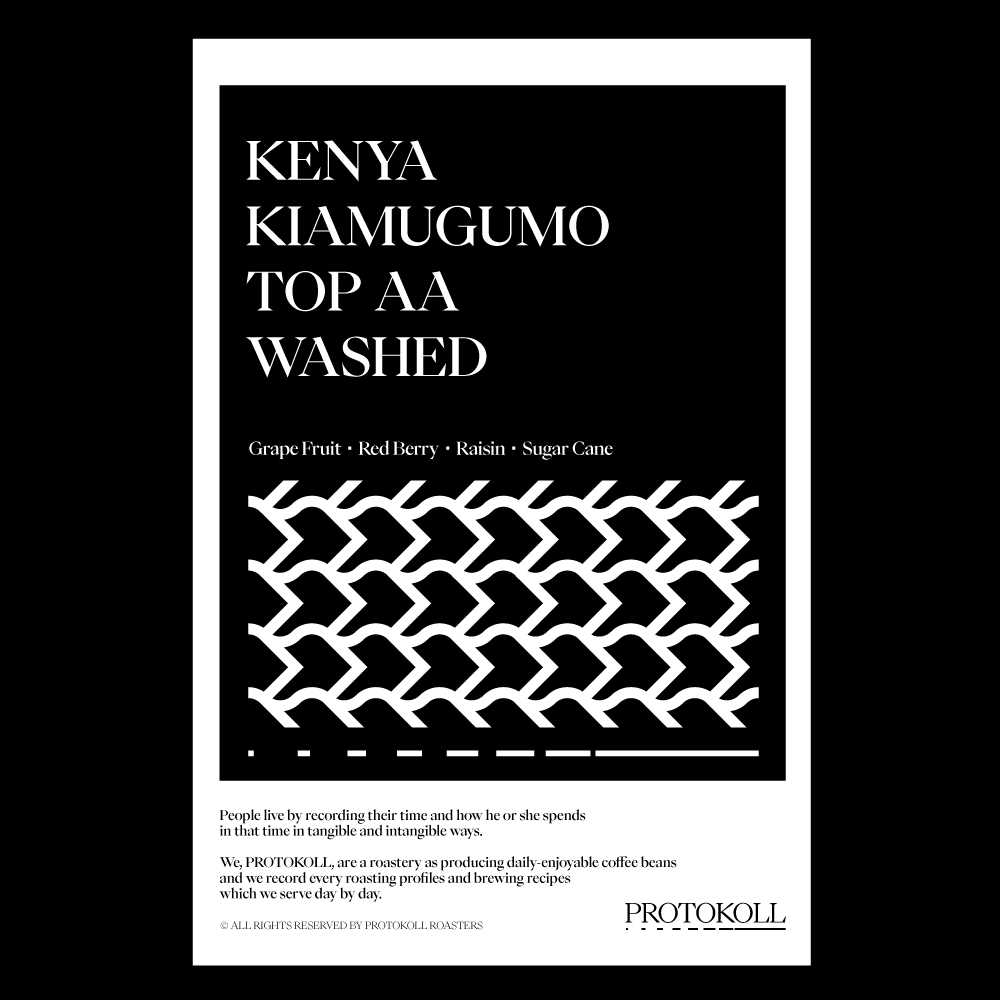 [2025] 2017년 설립된 키아무구모 워싱 스테이션은 Mt. Kenya의 비옥한 토양에 위치해 있으며, 약 1,500명의 소농들이 활동하고 있습니다. 일조량과 강우량이 풍부하고 일교차가 뚜렷해 커피 체리의 숙성과 향미 발달에 이상적인 환경을 갖추고 있습니다.이 커피는 펄핑 후 체리를 발효하여 세척하고 수분 함유량이 11-13%가 될 때까지 건조하였습니다.붉은 열매의 산미로 시작해 자몽과 같은 은은한 향미로 이어집니다.그 후 선명하며 깔끔한 단맛으로 마무리됩니다. 원산지 Kenya지역 Kirinyaga, Kiamugumo FCS품종 SL28, SL34가공 Washed고도 1,600-1,650m 커핑노트 Cupping NoteGrape Fruit • Red Berry • Raisin • Sugar Cane자몽 • 레드 베리 • 건포도 • 사탕수수 브루잉 가이드 레시피프로토콜의 브루잉 레시피입니다. 이 레시피는 원두 고유의 캐릭터를 또렷하게 느낄 수 있도록 전체적인 밸런스가 잘 느껴지도록 제안합니다. 안내된 방법에 따라 추출하시면, 프로토콜이 생각하는 맛있는 한 잔의 흐름을 가장 안정적으로 즐기실 수 있습니다. 하리오 V60 드리퍼를 기준으로 합니다 추출 전 필터지는 뜨거운 물로 충분히 린싱해 종이 향을 제거하고, 안정적인 추출 환경을 만들어 주세요. [HOT]원두는 18g, 물 온도는 94도를 사용합니다. 다음과 같이 물을 부어줍니다.(뜸) 40g – (30초) 100g – (1분) 80g – (1분 30초) 80g 총 300g의 물을 사용하며,대략적으로 2분 30초 내외로 추출이 완료됩니다. [ICE]원두는 20g, 물 온도는 94도를 사용합니다. 드립 서버에 얼음을 8알 정도를 담고 다음과 같이 물을 부어줍니다.(뜸) 40g – (30초) 60g – (1분) 50g – (1분 30초) 50g 총 200g의 물을 사용하며,대략적으로 2분 10초 내외로 추출이 완료됩니다.
