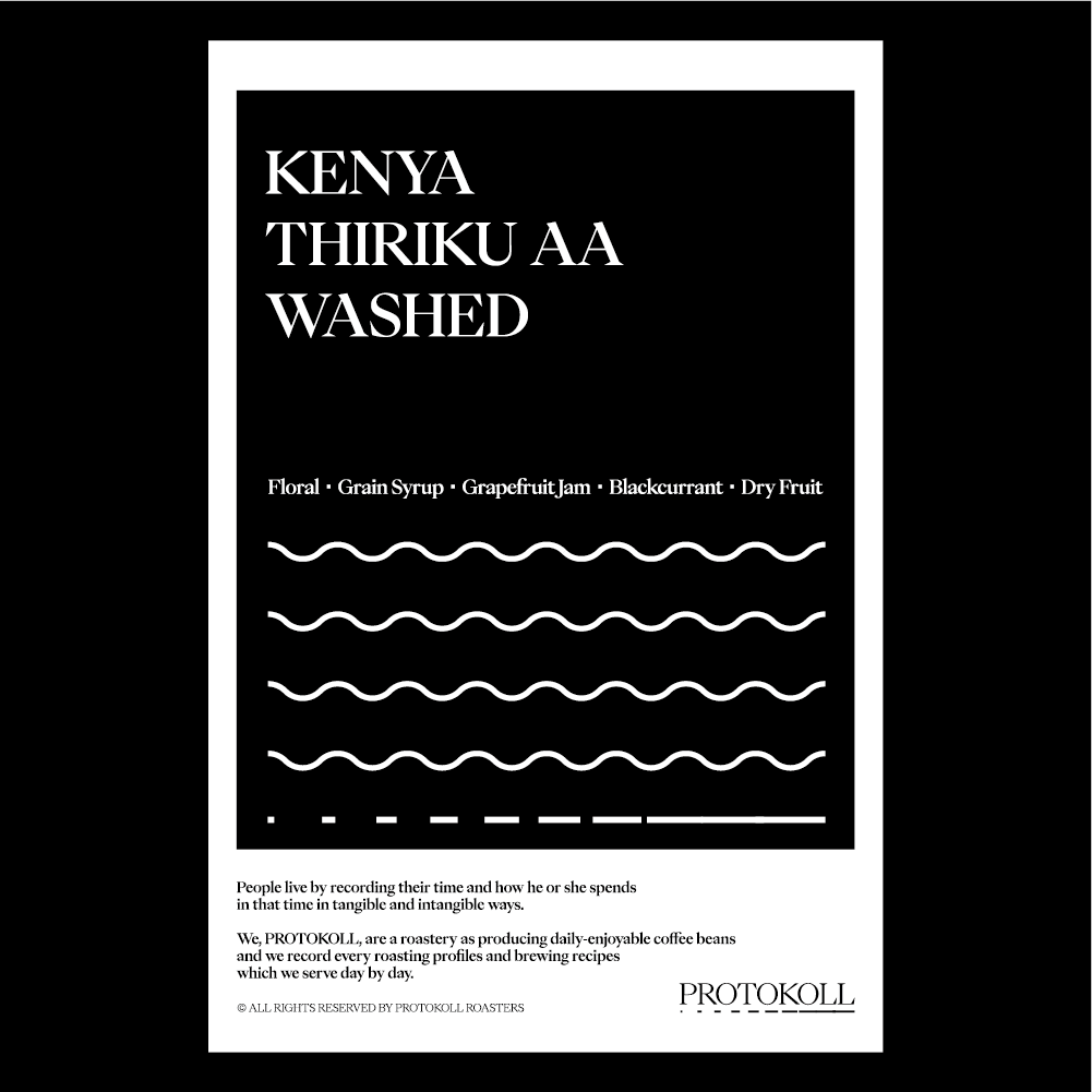 [2024] 커피를 재배하는 곳에서는 정미소 대신 워싱 스테이션이 있습니다.케냐 니에리 지역의 커피 소농 1000여 명이 모여 '띠리쿠'라는 이름의 협동조합을 만들었고, 이들이 재배한 커피는 공동의 워싱 스테이션에서 가공됩니다.띠리쿠 조합은 네덜란드 커피 회사 트라보카와 파트너십을 맺어 해외 로스터에게 자신들이 생산한 커피를 더 높은 가격으로 직접 판매할 수 있도록 거래 구조를 개선했습니다.이렇게 생긴 수익으로 생산자들의 사정이 더 나아졌고, 커피 품질을 높이는데 더 많이 투자할 수 있었습니다.오랜만에 선보이는 케냐 커피입니다.작년에 소개해 드린 은두은두리는 토마토의 느낌이 좋았다면, 이번에 소개해 드릴 케냐는 플로럴한 느낌과 조청, 자몽 잼 같은 조금은 더 단맛이 좋은 커피입니다. 원산지 Kenya지역 Nyeri품종 SL28가공 Washed고도 1,880 - 1,970m 커핑노트 Cupping NoteFloral • Grain Syrup • Grapefruit Jam • Blackcurrant • Dry Fruit플로럴 • 조청 • 자몽 잼 • 블랙커런트 • 건과일 브루잉 가이드 레시피프로토콜의 브루잉 레시피입니다. 이 레시피는 원두 고유의 캐릭터를 또렷하게 느낄 수 있도록 전체적인 밸런스가 잘 느껴지도록 제안합니다. 안내된 방법에 따라 추출하시면, 프로토콜이 생각하는 맛있는 한 잔의 흐름을 가장 안정적으로 즐기실 수 있습니다. 하리오 V60 드리퍼를 기준으로 합니다 추출 전 필터지는 뜨거운 물로 충분히 린싱해 종이 향을 제거하고, 안정적인 추출 환경을 만들어 주세요. [HOT]원두는 18g, 물 온도는 94도를 사용합니다. 다음과 같이 물을 부어줍니다.(뜸) 40g – (30초) 100g – (1분) 80g – (1분 30초) 80g 총 300g의 물을 사용하며,대략적으로 2분 30초 내외로 추출이 완료됩니다. [ICE]원두는 20g, 물 온도는 94도를 사용합니다. 드립 서버에 얼음을 8알 정도를 담고 다음과 같이 물을 부어줍니다.(뜸) 40g – (30초) 60g – (1분) 50g – (1분 30초) 50g 총 200g의 물을 사용하며,대략적으로 2분 10초 내외로 추출이 완료됩니다.