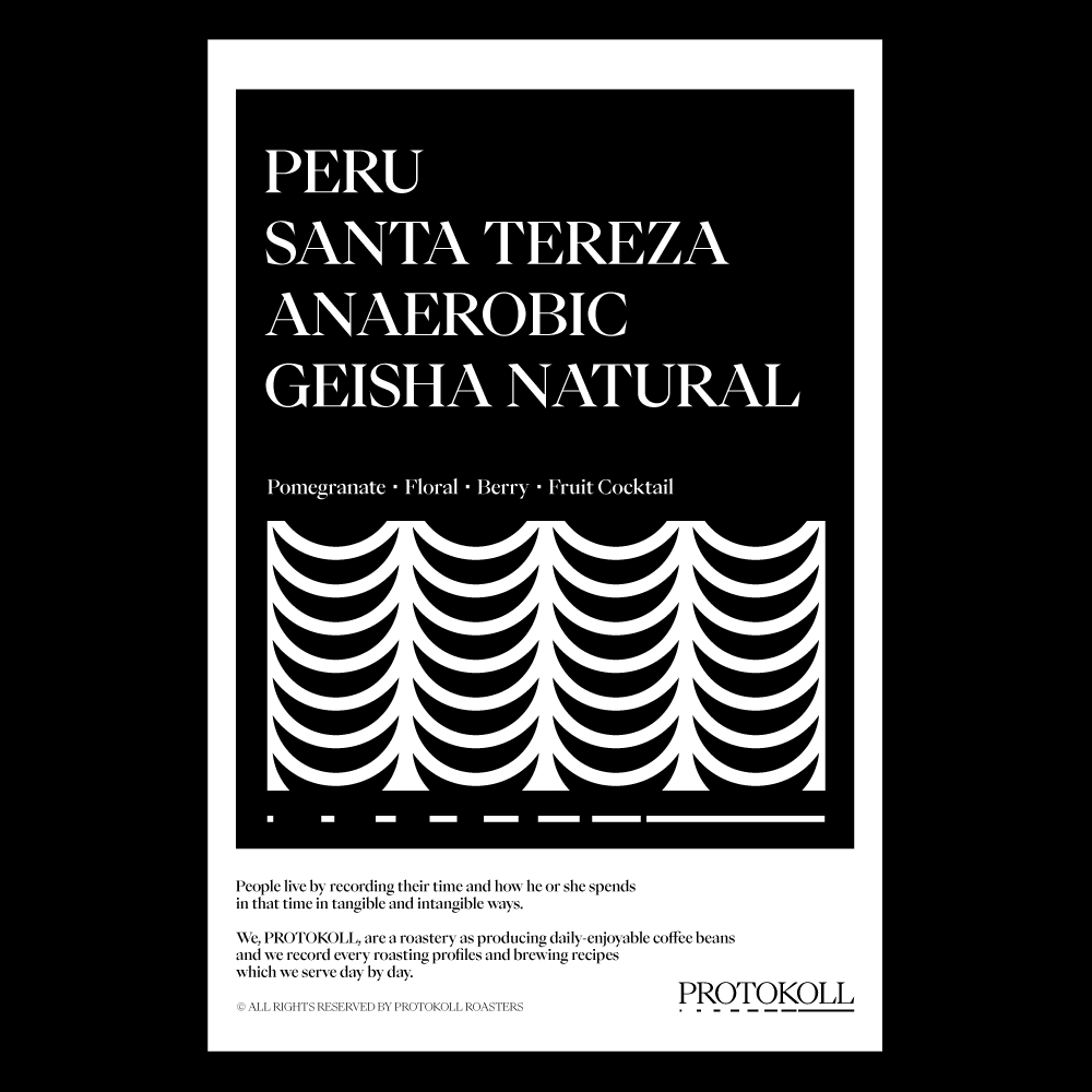 [2026] 석류를 떠올리게 하는 산뜻한 산미와 화사한 꽃향을 시작으로 베리류의 달콤함과 풍미, 카라멜을 닮은 묵직한 질감이 중심을 잡아주어 깊이 있는 마무리를 느낄 수 있습니다.안데스 고지대에서 천천히 익은 체리를 무산소 내추럴로 가공해 게이샤 특유의 향긋함과 복합적인 과일 풍미를 또렷하게 담아내며 향과 질감이 조화로운 전체적인 인상을 완성합니다.페루는 전 세계에서 유기농 및 공정무역 인증 커피를 가장 많이 생산하는 국가 중 하나로, 4월부터 9월까지 이어지는 수확기에 생산된 페루 커피는 '안데스의 보석'이라 불릴 만큼 완성도 높은 커피로 알려져 있습니다. 원산지 Peru지역 Amazonas, Luya, Camporedondo품종 Geisha가공 Anaerobic Natural고도 1,680m 커핑노트 Cupping NotePomegranate・Floral・Berry・Fruit Cocktail석류・플로럴・베리・후르츠 칵테일 브루잉 가이드 레시피프로토콜의 브루잉 레시피입니다. 이 레시피는 원두 고유의 캐릭터를 또렷하게 느낄 수 있도록 전체적인 밸런스가 잘 느껴지도록 제안합니다. 안내된 방법에 따라 추출하시면, 프로토콜이 생각하는 맛있는 한 잔의 흐름을 가장 안정적으로 즐기실 수 있습니다. 하리오 V60 드리퍼를 기준으로 합니다 추출 전 필터지는 뜨거운 물로 충분히 린싱해 종이 향을 제거하고, 안정적인 추출 환경을 만들어 주세요. [HOT]원두는 18g, 물 온도는 94도를 사용합니다. 다음과 같이 물을 부어줍니다.(뜸) 40g – (30초) 100g – (1분) 80g – (1분 30초) 80g 총 300g의 물을 사용하며,대략적으로 2분 30초 내외로 추출이 완료됩니다. [ICE]원두는 20g, 물 온도는 94도를 사용합니다. 드립 서버에 얼음을 8알 정도를 담고 다음과 같이 물을 부어줍니다.(뜸) 40g – (30초) 60g – (1분) 50g – (1분 30초) 50g 총 200g의 물을 사용하며,대략적으로 2분 10초 내외로 추출이 완료됩니다.